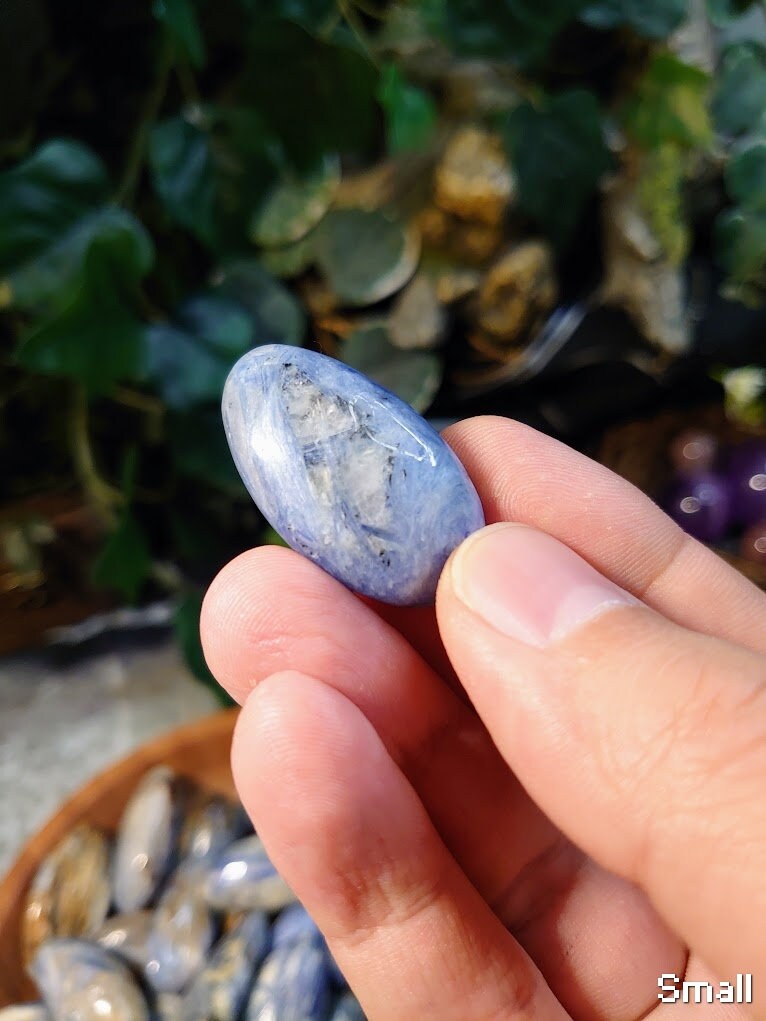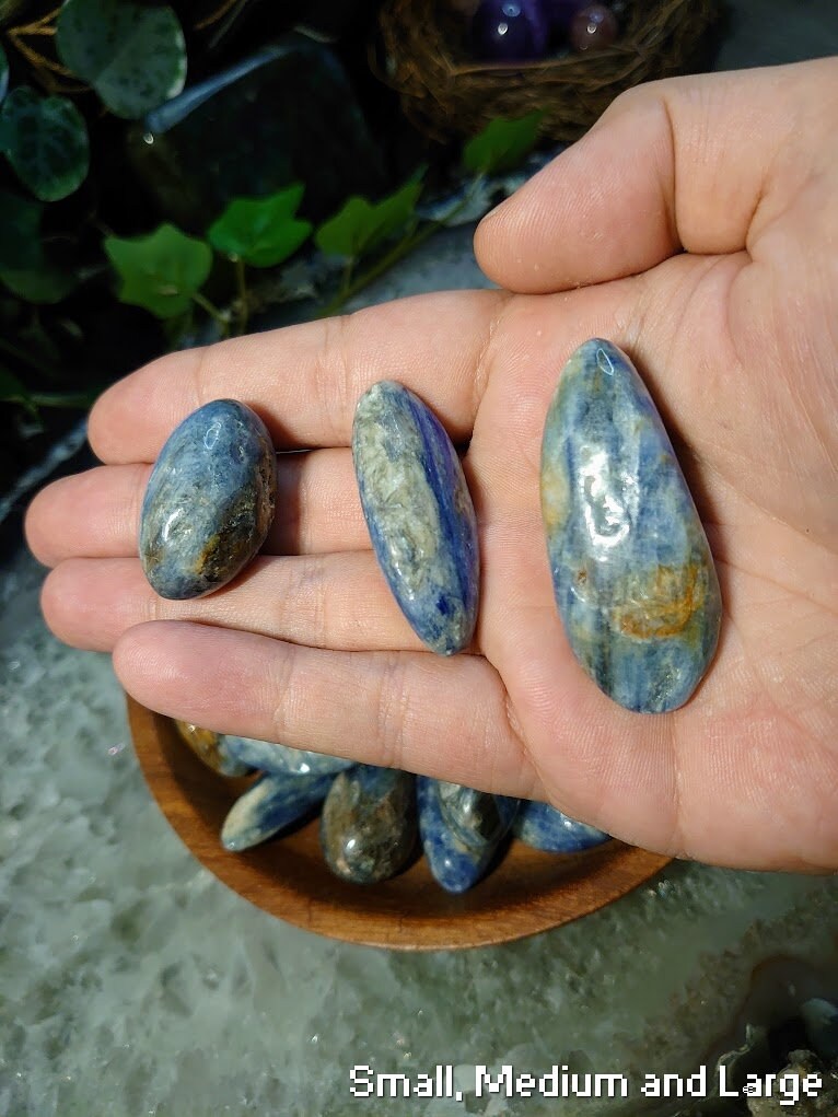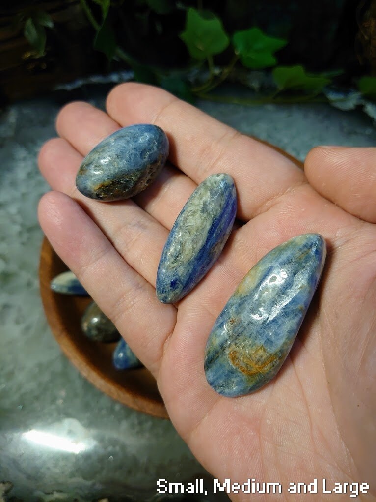 Beautiful tumbled kyanite and clear quartz stones from Brazil! The blades of blue kyanite can be seen growing in tandem with the quartz. They do vary in shape and so you must pick the size desired. They in general have more of an elongated tumble. The largest size almost feels like a tear drop shaped palmstone!