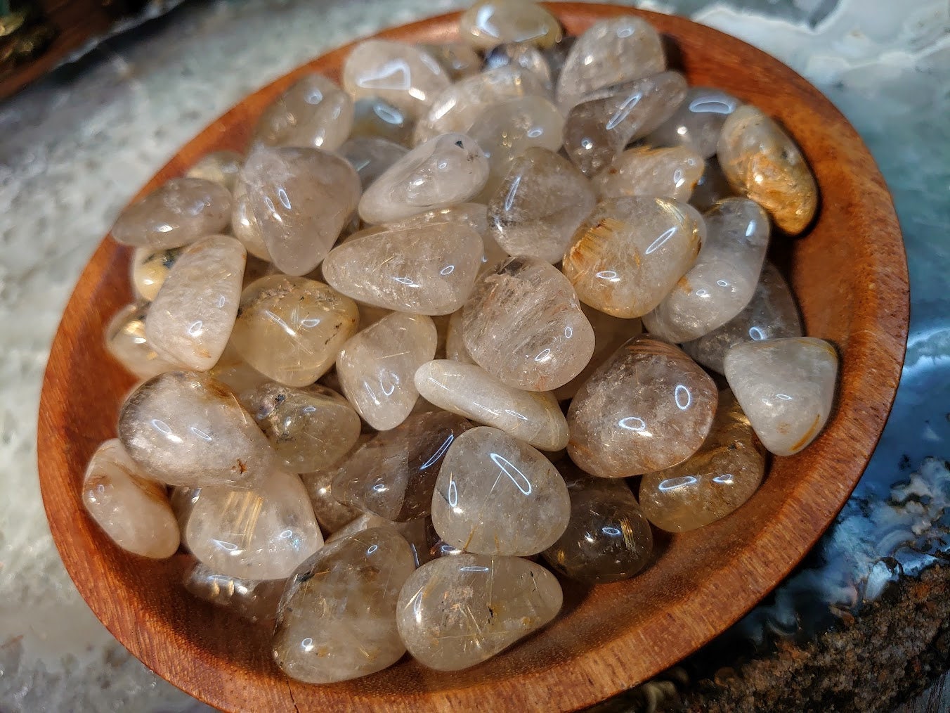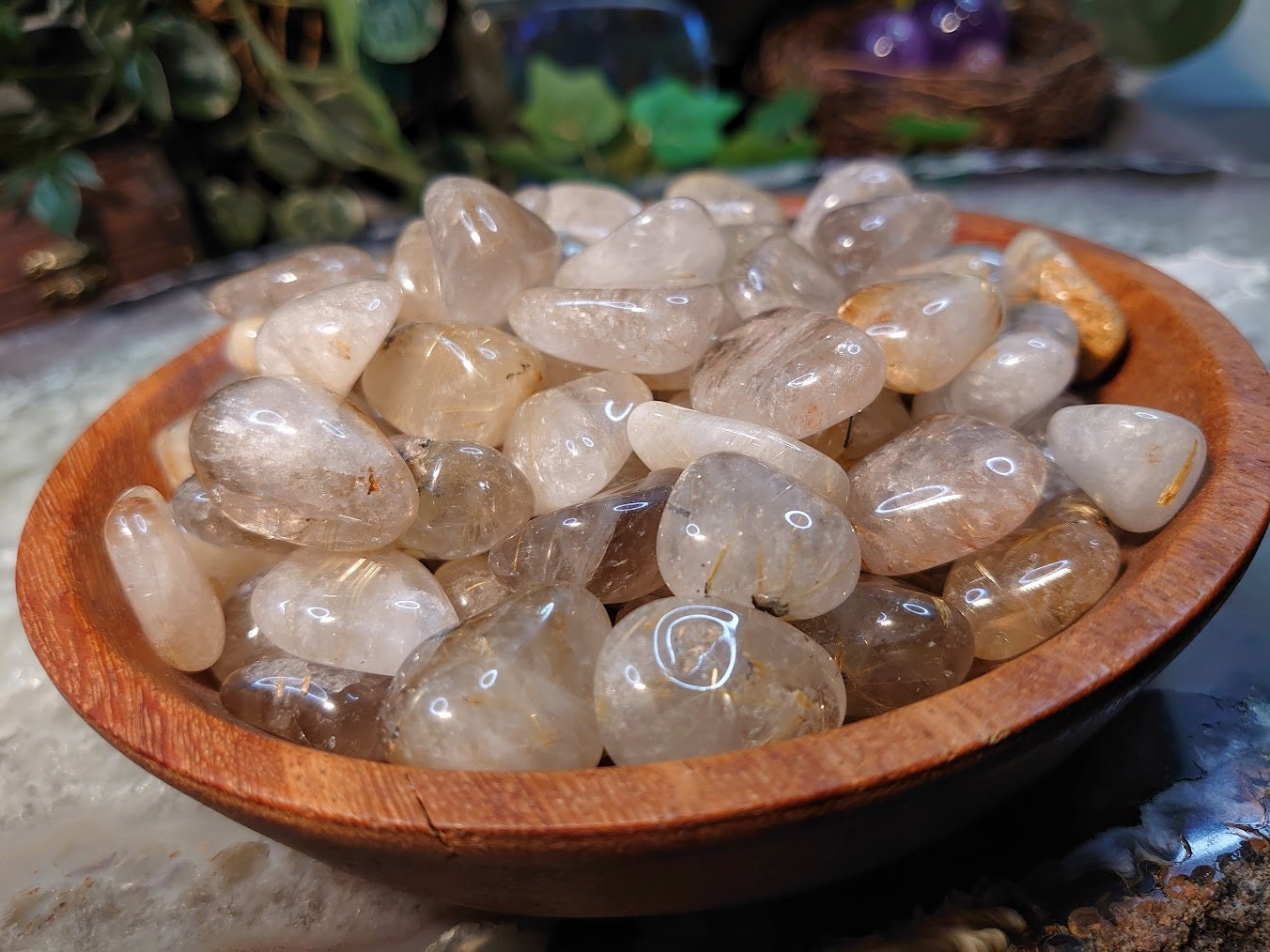 This listing is for Rutilated Quartz tumbles! These clear quartz tumbles have fine golden rutile growing throughout them.
